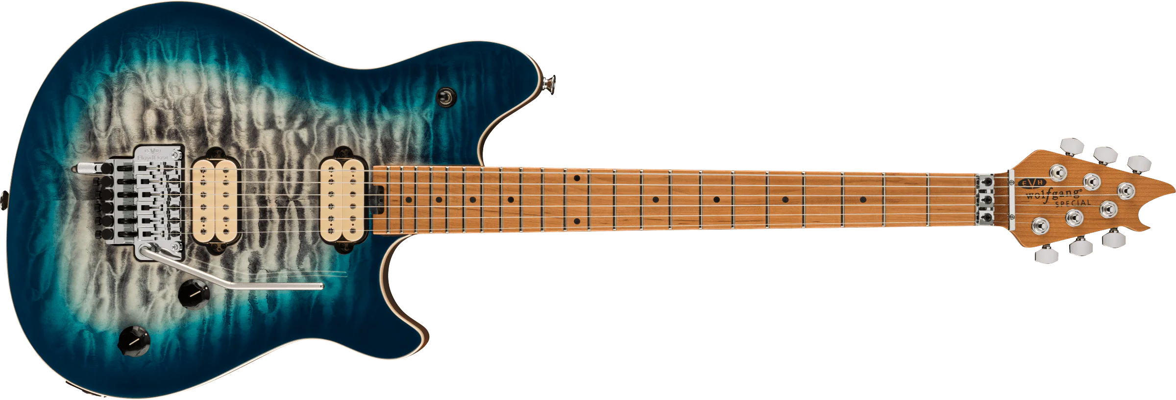 Die Wolfgang Special QM verfügt über einen Korpus aus Linde mit einer gewölbten Decke aus Riegelahorn und einen robusten, graphitverstärkten, geschraubten Hals aus geröstetem Ahorn. Der Hals wurde nach Eddie Van Halens präzisen Vorgaben geschnitzt und abgerundet und ist auf der Rückseite mit einem handpolierten, seidenmatten Urethanlack versehen. Das Griffbrett aus geröstetem Ahorn mit Compound-Radius (12″–16″), 22 Jumbo-Bünden und schwarzen Punktinlays ist perfekt für High-Performance, energiegeladene Riffs und rasante Soli geeignet. Dank eines praktischen Einstellrads am Halsfuß ist die Halsstabjustierung so einfach wie nie zuvor.