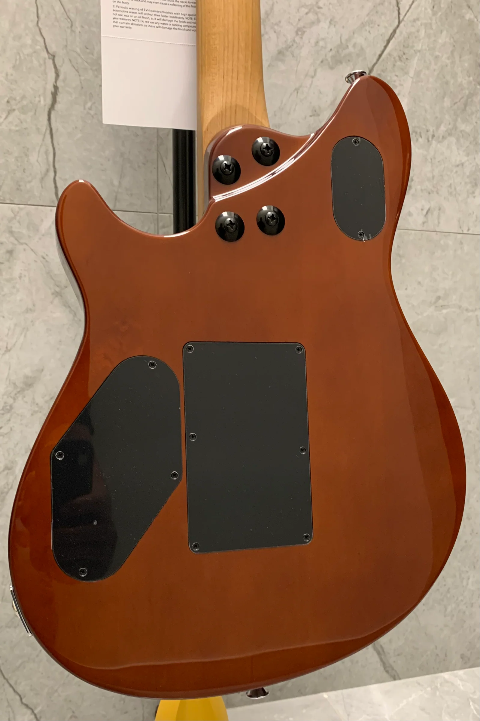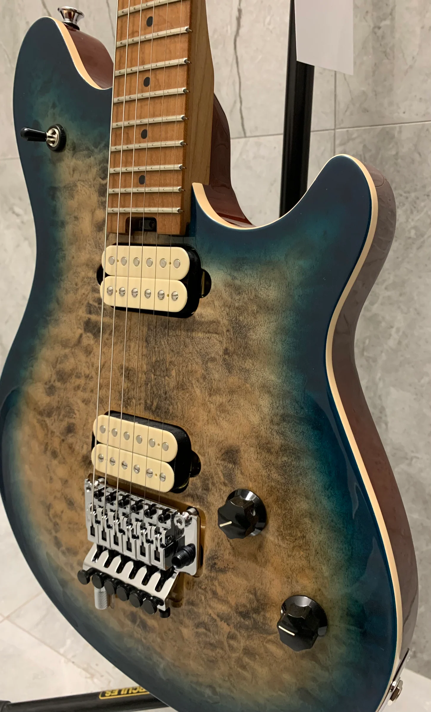 Zwei exklusive, speziell entwickelte EVH® Wolfgang Alnico 2 Humbucker-Tonabnehmer sind direkt am Korpus montiert und liefern einen dynamischen und zugleich differenzierten Klang sowie endloses Sustain für kraftvolle Akkorde und Melodien. Ein robustes und zuverlässiges EVH Floyd Rose® Locking-Tremolo und ein Floyd Rose Locking-Sattel sorgen gemeinsam für präzises Stimmen, selbst bei extremen Tonhöhenänderungen. Mit dem EVH D-Tuna® lässt sich die Gitarre im Handumdrehen präzise von Drop-D und zurück stimmen. Der Lautstärkeregler mit Treble-Bleed-Schaltung verfügt über ein reibungsarmes 500k EVH Bourns® Potentiometer für sanfte Lautstärkeübergänge, während der Tonregler mit einem reibungsarmen 250k Bourns® Potentiometer ein versehentliches Verstellen der Tonhöhe verhindert.