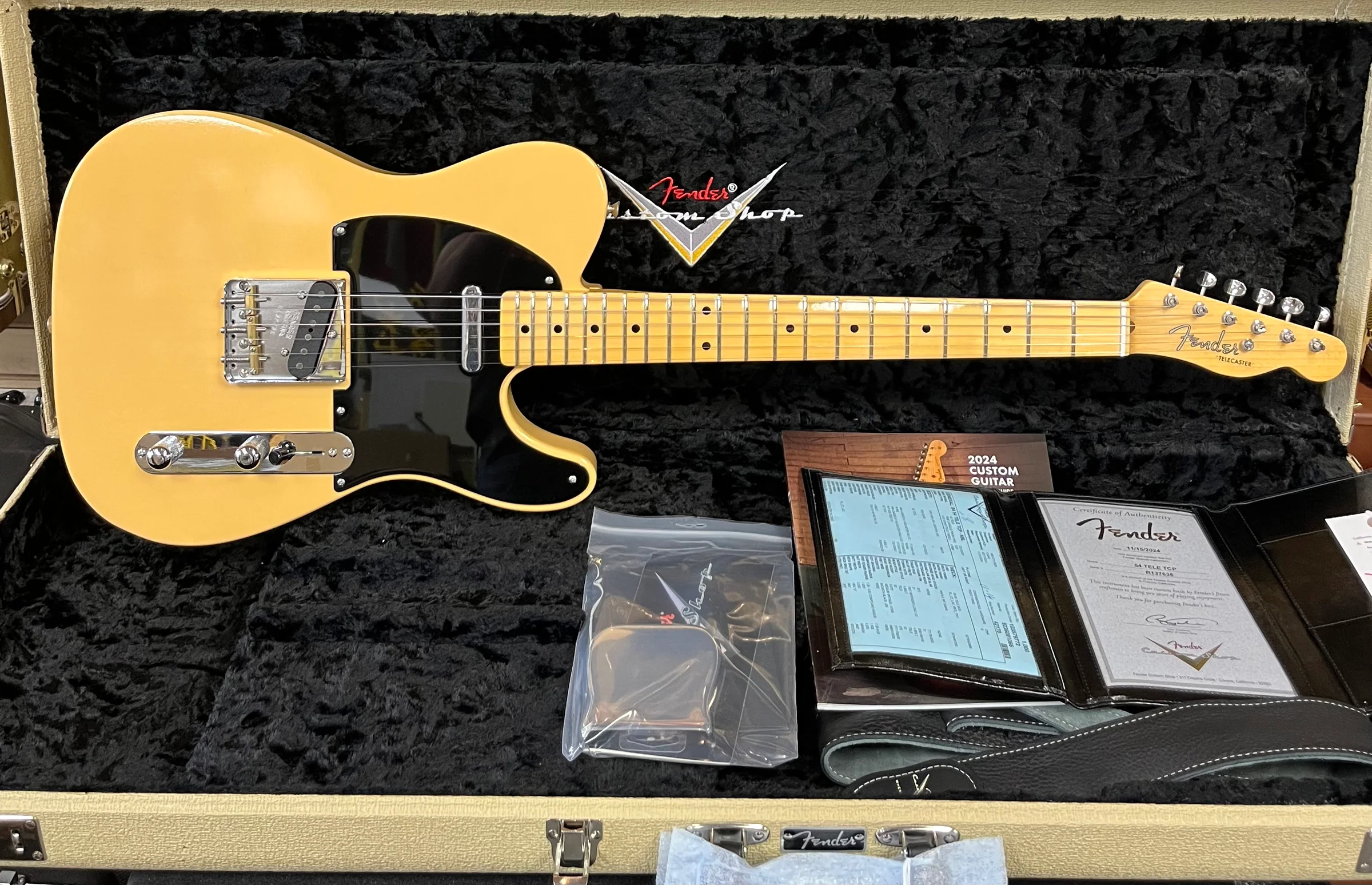 Neu im Jahr 2024: Der Fender Custom Shop präsentiert ein einzigartiges Modell aus der Übergangszeit der Telecaster® – die 1954 Telecaster®. Anfang 1954 wurde die legendäre, einlagige schwarze Phenolharz-Schlagbrettplatte auf dem Korpus, den wir heute als Nocaster® Blonde kennen, zum letzten Mal produziert. Später wurde auf eine einlagige weiße ABS-Schlagbrettplatte umgestellt, passend zur neuen Stratocaster®.